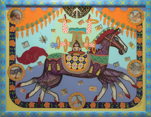 今回は、このガラス絵の技法に、僕なりのアレンジを加えて、ギリシャ神話などをモチーフにした、カラフルでキッチュな僕の世界を表出したいと思ってい